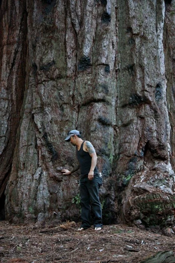 Ancient trunk, North America (circa 2006). The author pictured before geological time - standing within the slow intelligence of matter.
