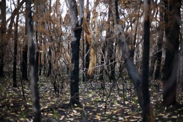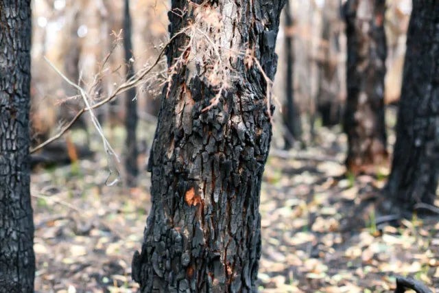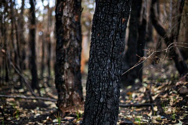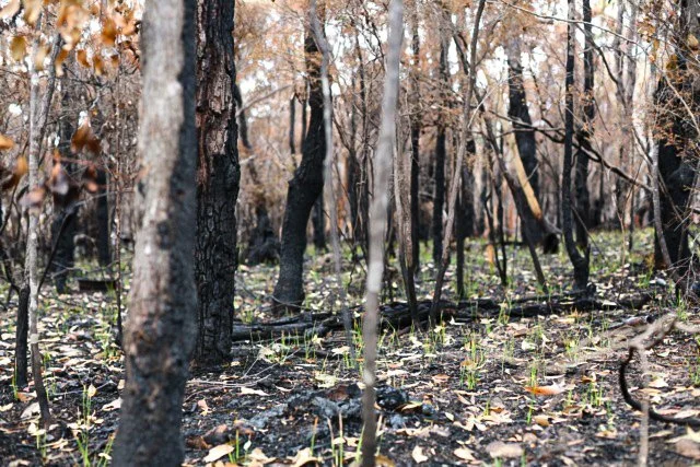 Charred forest, Central Coast NSW - renewal emerging through ash.